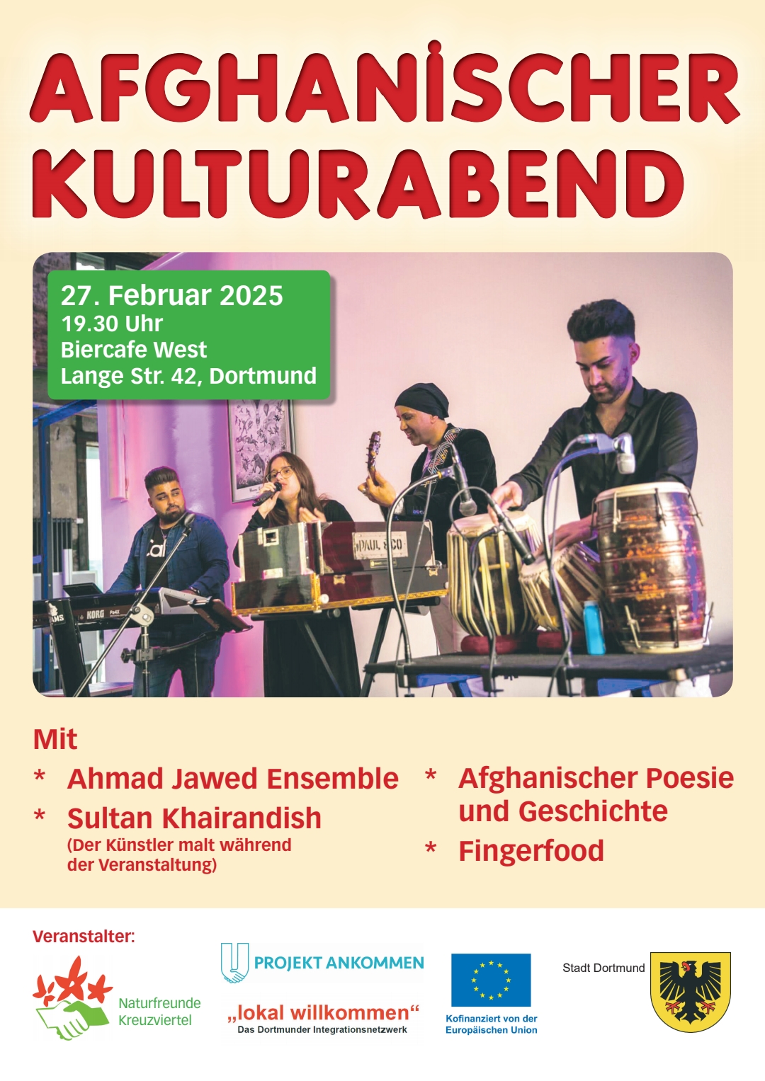 FAST 200 PERSONEN im total überfüllten BierCafeWest. WAHNSINN! Danke an alle. Die Veranstalter: Projekt Ankommen, Lokal Willkommen/Stadt Dortmund, die Naturfreunde Kreuzviertel Afghanistan ist durch die Berichterstattung über den Krieg und das Leiden der Menschen bekannt. Die Geflüchteten, die zu uns gekommen sind, mussten ein Land mit einer großartigen und Jahrtausende alten ...WEITERLESEN